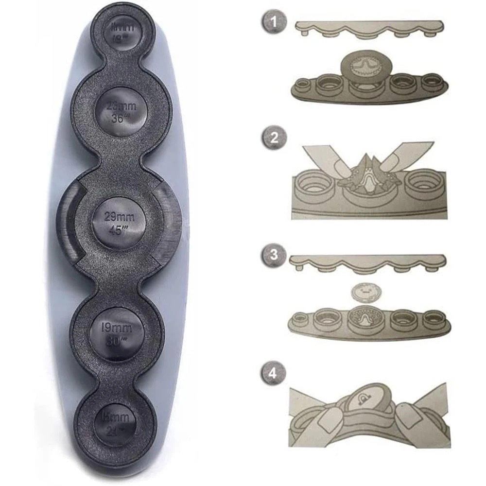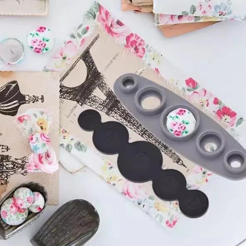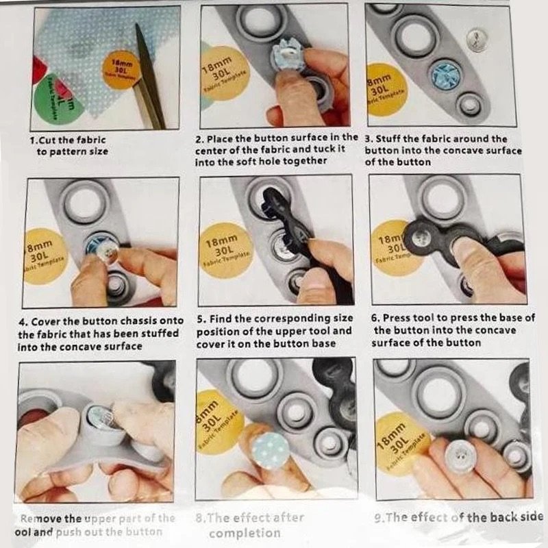 تتكون المجموعة من أدوات بأحجام مختلفة (11 ملم، 15 ملم، 19 ملم، 29 ملم، و33 ملم)، تسمح لك بعمل أزرار من الأقمشة المزخرفة أو العادية، وتُعطي نتائج مرتبة واحترافية في كل مرة. كل ما عليك هو وضع القماش المفضل لديك داخل القالب، الضغط بالقطعة المناسبة، وستحصل على زر جميل جاهز للخياطة أو التثبيت.